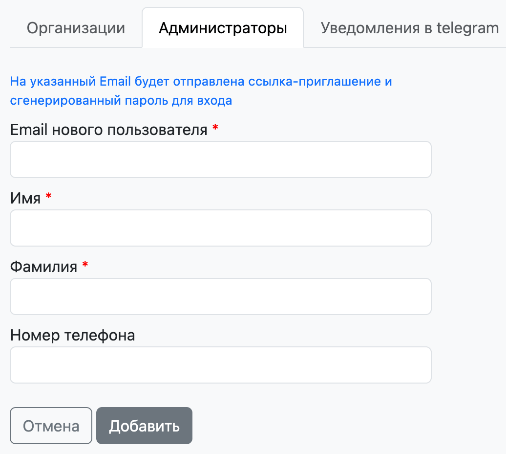 После добавления администратора на указанный e-mail будет отправлена ссылка-приглашение и сгенерированный пароль для входа.
