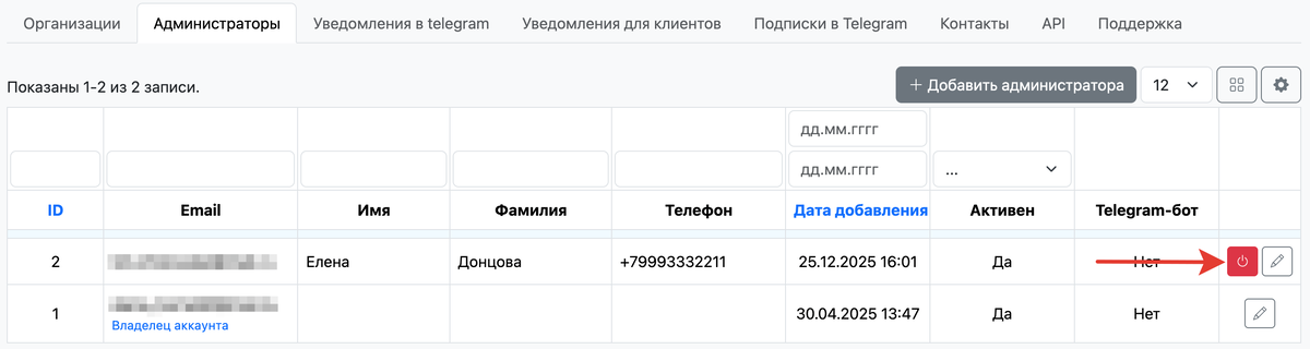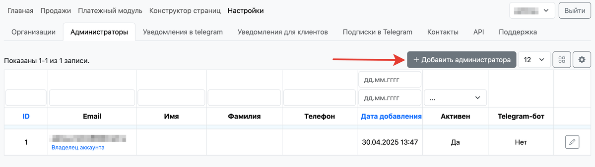 Для этого необходимо перейти в раздел «Настройки — Администраторы» и нажать кнопку «Добавить администратора».