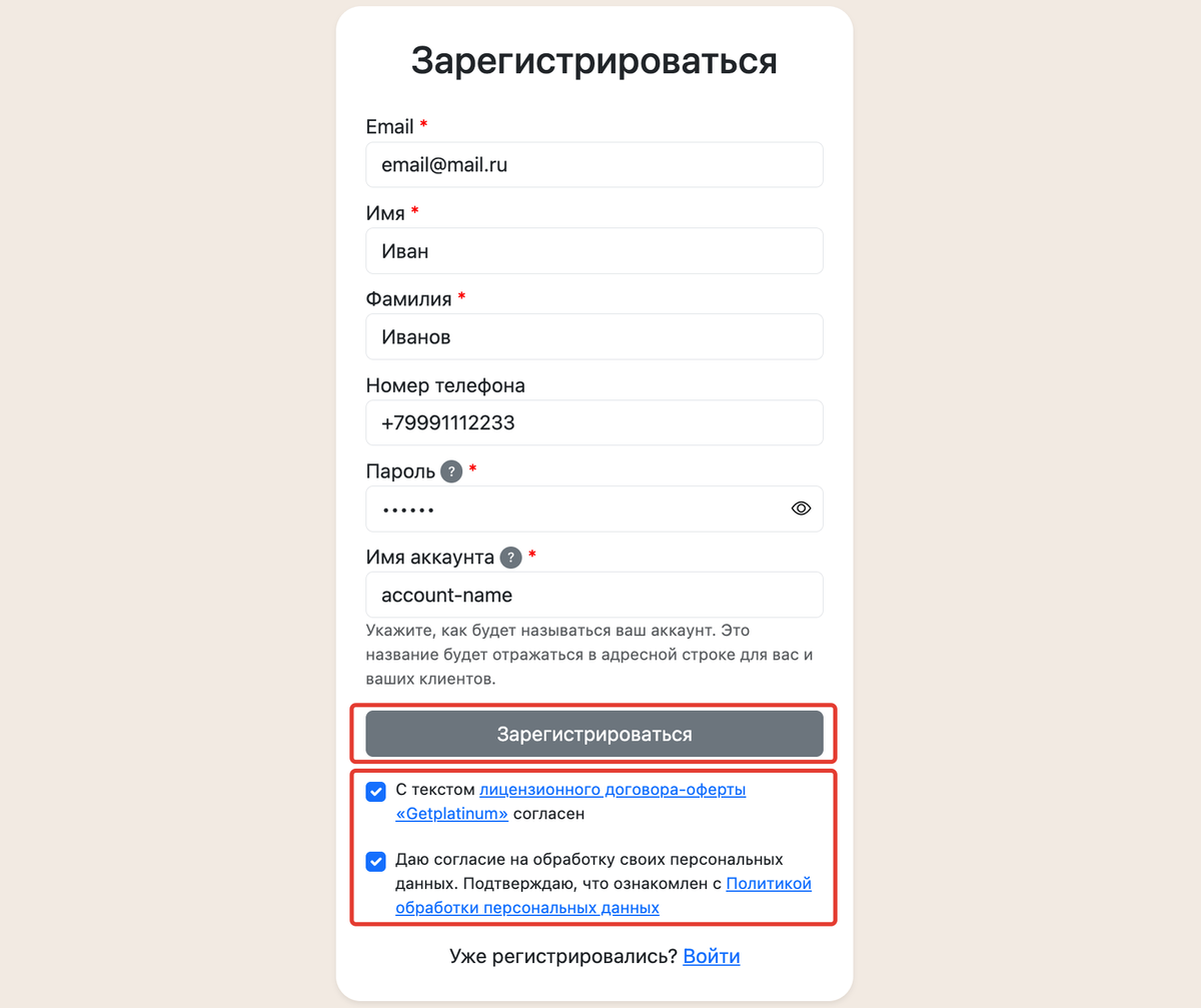 После заполнения формы отметьте чекбоксы согласия с договором-оферты и политикой обработки персональных данных. Затем нажмите кнопку «Зарегистрироваться».