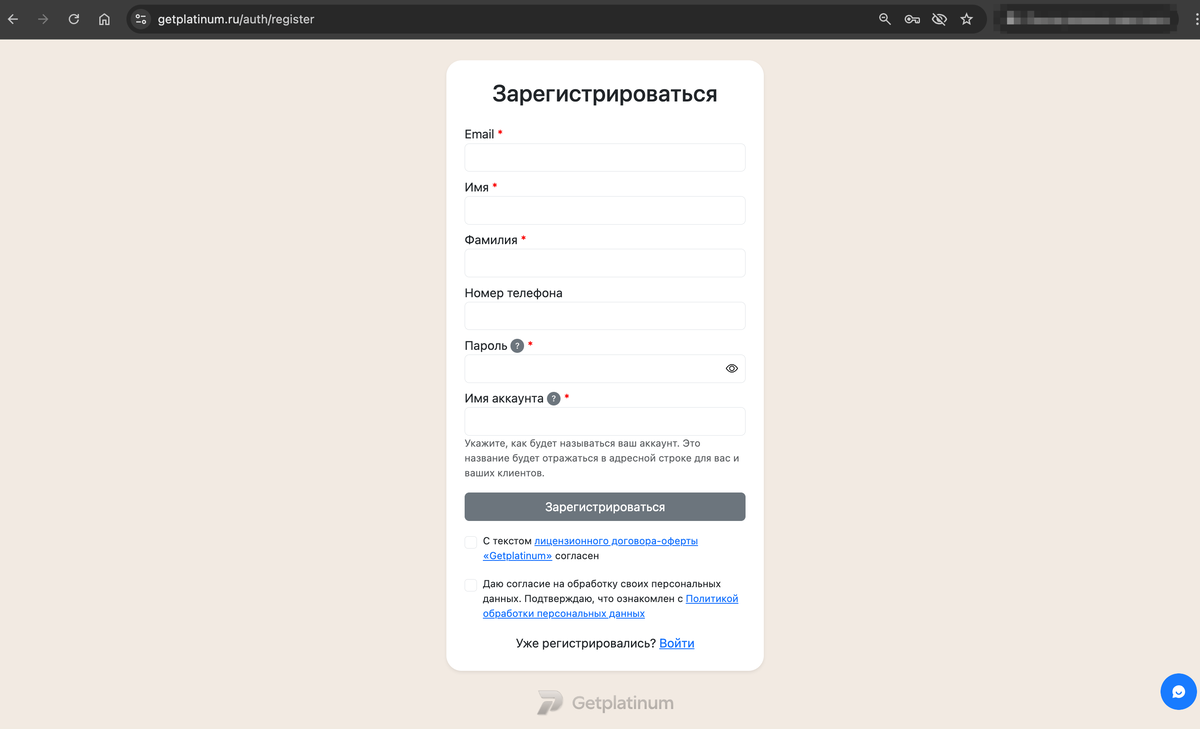 Для подключения к платформе необходимо создать личный кабинет. Для этого заполните форму на сайте по ссылке: https://getplatinum.ru/auth/register .