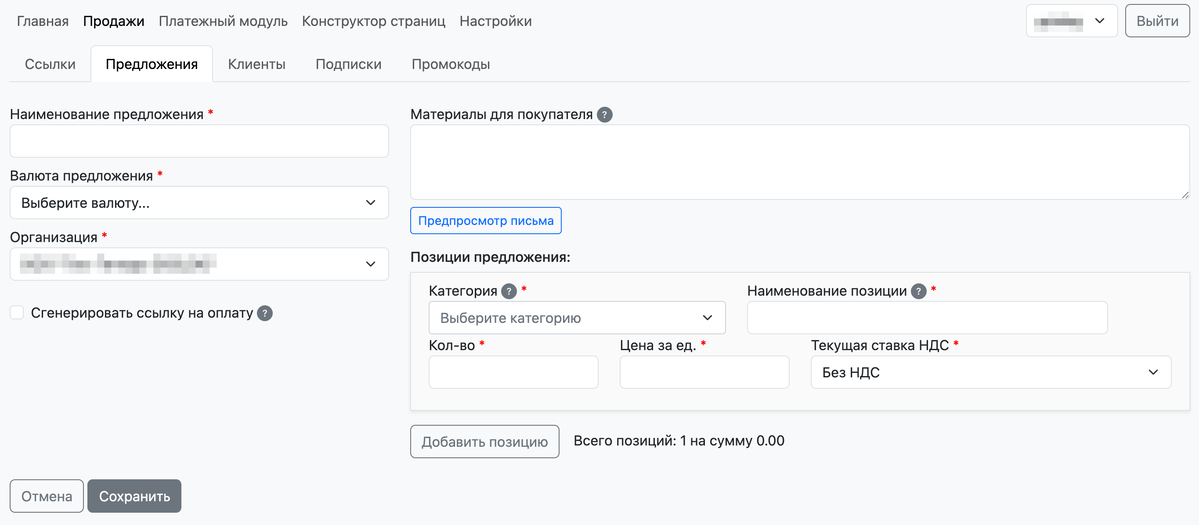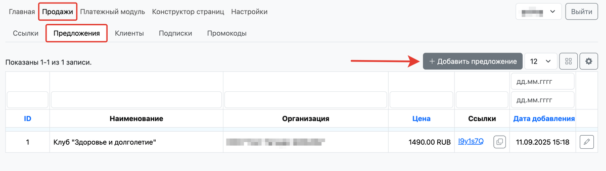 Для создания предложения для продажи перейдите в раздел «Продажи — Предложения», и нажмите «Добавить предложение».