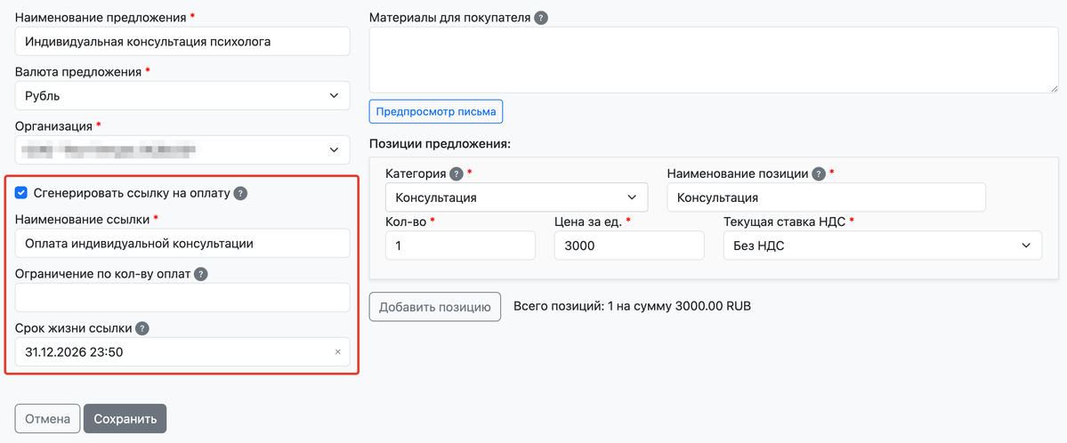 Чтобы создать ссылку на оплату данного предложения, отметьте чекбокс «Сгенерировать ссылку на оплату».