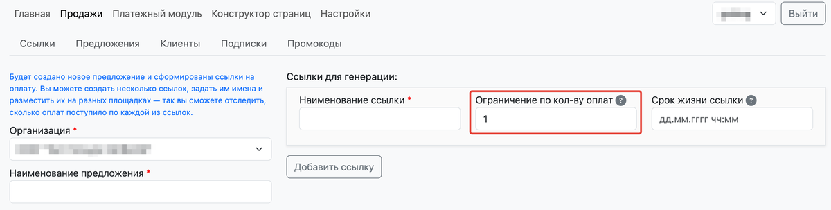 При создании быстрой ссылки вы можете установить ограничение по количеству оплат в соответствующем поле.