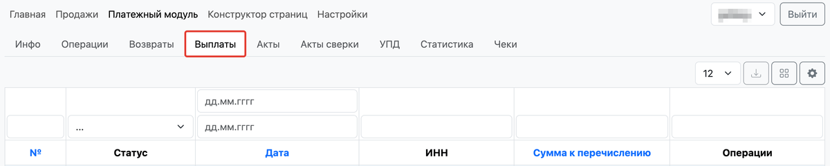 Вся информация по платежам доступна в разделе «Платежный модуль» на следующих вкладках: