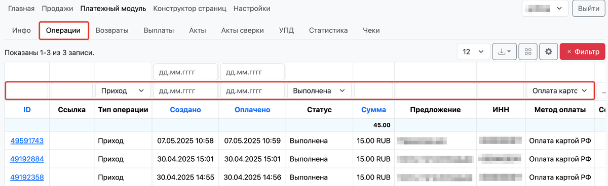 В разделе «Операции» можно фильтровать платежи по тому или иному запросу (например, по дате оплаты или по методу оплаты), после чего скачать реестр и просмотреть всю необходимую информацию.